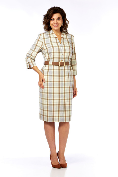 Женское платье полуприлегающего силуэта выполнено из плательно-костюмной ткани в клетку. Платье с центральной застёжкой на 3 петли и пуговицы . Перед со средним швом заканчивающимся шлицей, рельефами из пройм до боковых швов,в швах выполнены карманы,и нагрудными вытачками.Спинка цельная.По переду и спинке в области талии выполнены шлевки для ремня. Рукава втачные , двухшовные, длиной 3/ 4. Внизу верхнего  шва  рукава декоративные пуговицы и разрез. Вырез горловины фигурный со стойкой.