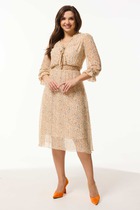 Платье-рубашка прямого силуэта, застежка центральная на петли и пуговицы. Горловина округлой формы с воротником - стойкой. Плечо чуть спущено. Рукав втачной двух шовный, низ рукава оформлен разрезом на манжете с двумя пуговицами.