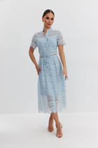 Платье женское, повседневное, полуприлегающего силуэта, отрезное по линии талии, длиной ниже линии колен, из хлопковой ткани. Перед с застежкой на пуговицы. Вырез горловины обработан воротником на стойке. Рукав втачной, по низу обработан цельнокроенной манжетой. Длина по спинке 117 см, длина рукава 16,5 см.