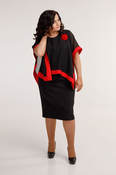 Платье женское полуприлегающего силуэта двухслойное. Прилегание достигается за счет нагрудных вытачек и талиевых по спинке. Застежка молния по спинке. Верхняя часть платья из шифона с притачной контрастной планкой по всей длине. Спереди короче, по спинке длиннее. Платье украшено съемной брошью. Длина изделия- 105 см, накидки спереди- 57 см, по спинке- 74 см.