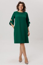 Платье женское А-силуэта.Перед с центральным швом и отделочной строчкой, по низу с приточным валаном.Рукав втачной свободного кроя.Перед и валан украшены пуговицами.