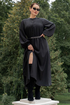 Филау – платье полуприлегающего силуэта из трикотажа и декоративных однотонных вставок. Вырез горловины классический овальный, оторочен по краям кантом. Рукава 3/4, втачные, оторочены манжетами. По бокам от рукавов к юбке – лампасы. На спинке – потайной замок-“молния”.