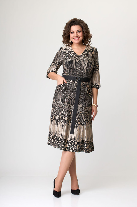 Платье полуприлегающего силуэта, отрезное по линии талии, юбка шестиклинка, расширенная к низу. На уровне бедер карманы с отложенным клапаном. На лифе по переду центральный шов, горловина V-образная. Рукава втачные одношовные с отложной манжетой. В комплект входит ремень. Платье без подкладки.