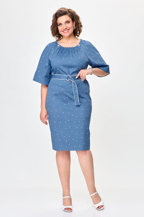 Элегантное женское платье выполнено из хлопка с содержанием эластана. Платье полуприлегающего силуэта. Горловина круглая, собрана на резинку с декоративными бусинам. Застежка в среднем шве спинки на тесьму молния. Рукав реглан, расширенный книзу, длина до локтя. В комплект ходит съемный пояс на пряжке и с декоративным кантом. Платье без подкладки.