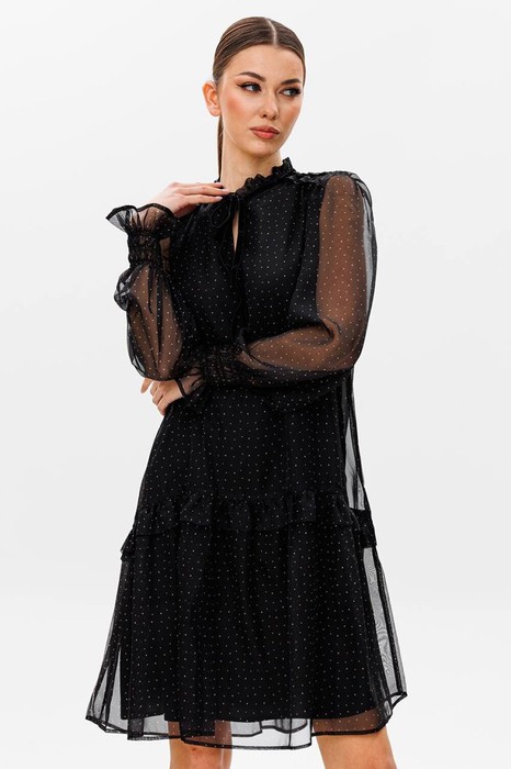Платье А-образного силуэта с воланом по низу и втачным рукавом со сборкой по окату и внизу на резинках. По шву втачивания волана, плечевому шву вставлена рюша со сборкой. По горловине втачена стойка со сборкой и декаративной тесьмой. Платье на подкладке.