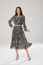 Платье полуприлегающего силуэта отрезное по линии талии, нижняя часть расширена, с воланом по низу. Платье с втачным рукавом со сборкой по окату и внизу на резинке. Лиф с V-образным вырезом и имитацией центральной застежкой на пуговицы. По спинке и переду вставка на талии с резинками. По горловине стойка с рюшей, которая завязывается по переду. Платье на подкладке.
