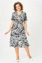 Платье рубашка прямого силуэта с отложным воротником на стойке. По переду – нагрудные выточки, карманы в боковых швах. Застежка в виде планки на декоративных пуговицах-до талии и потайные пуговицы-ниже талии. Ассиметричная деталь-пояс на полукольцах. Фигурные разрезы в боковых швах. По спинке фигурная кокетка, центральный шов со встречной складкой в верху. Рукав в точной 1-шовный, длинный с застёжкой на планку спереди, со складкой по низу и манжетой