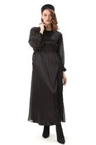 Платье женское приталенного силуэта из костюмной ткани. Вырез горловины оформлен воротником рубашечного типа. Застежка - потайная на петли с пуговицами. Рукава - втачные с мягкой складкой в области оката. Низа посажены на отрезные манжеты с застежкой на петли с пуговицами. Отрезное по линии талии. В боковых швах имеются карманы. Справа выполнен разрез, слева - складки. Изделие декорировано съемной баской.