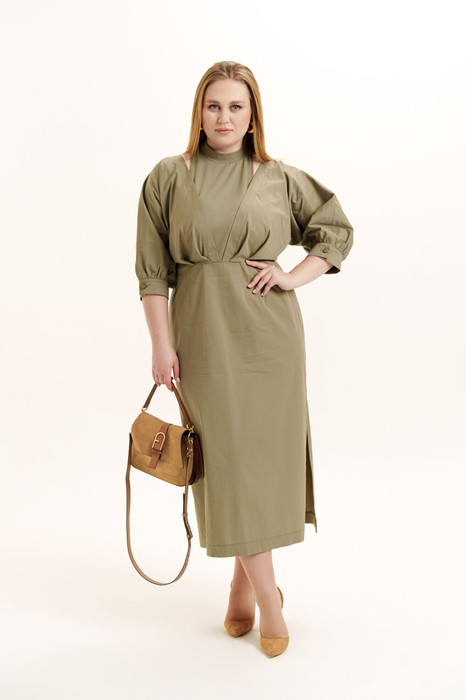 Красивое, стильное и элегантное  платье прямого силуэта  выполнено из хлопкового  полотна и элит трикотажа. Модель платья классика с рукавом 3/4 ЛЕТУЧАЯ МЫШЬ, низ рукава на манжете. Горловина оформлена воротником - стойка из отделочной ткани с застежкой по спинке на потайную молнию , что делает платье универсальным нарядом в гардеробе любой женщины или девушки. На платье обработан подрез со складками. По боковому шву разрез.