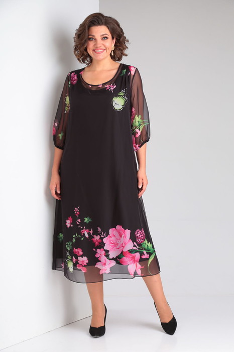 Платье женское двухслойное, расклешеное к низу. Верхнее платье из цветного шифона: перед с тремя застроченными складками у плеча. Рукав втачной, одношовный, снизу на резинке. Горловина округлой формы, проймы маечного типа. Перед с нагрудными вытачками. Нижнее и верхнее платье скреплены по плечу.
