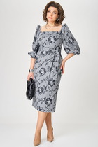 Платье прилегающего силуэта, длиной за колено. С декоративным вырезом по переду. Спинка с талиевыми вытачками и средним швом, в котором обработана застежка на потайную тесьму-*молнию* и шлица. По горловине спинки разрез с застежкой на пуговицу. Платье с нагрудными и талиевыми вытачками и кокеткой из отделочной ткани ( сетка).