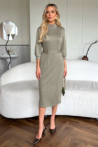 Силуэт платья прилегающий, линия талии подчёркнута втачным широким поясом.