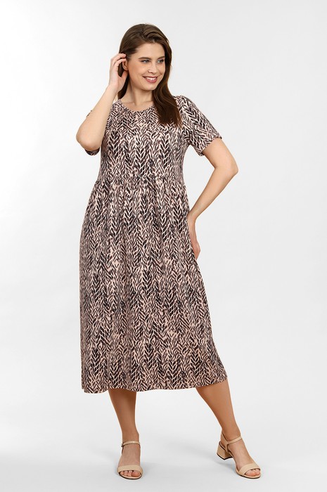 Платье из трикотажного вискозного полотна с набивным рисунком, свободного покроя, отрезное по линии талии, с короткими втачными рукавами и горловиной овальной формы, обработанной окантовкой из основного материала. Юбка присборена по шву соединения с верхней деталью.