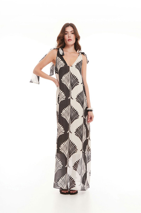 Платье женское, расширенное книзу, длиной макси, без рукавов. Горловина с V-образным вырезом по переду и спинке. Спинка со средним швом. На бретелях съемные банты.
