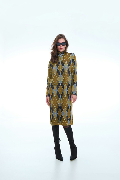 Платье женское, прямого силуэта, длиной ниже колена. В нижней части  боковых швов разрезы. По переду застежка на молнию. В боковых швах карманы. Рукав длинный. Воротник стойка