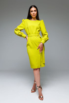 Платье выполнено из плательной ткани. Платье А-образного силуэта, длиной выше линии колена. Горловина округлой формы. Застежка на потайную молнию в среднем шве спинки. По низу платья широкий волан. Платье декорировано рюшами из основной ткани по проймам и горловине переда.