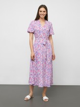 Платье выполнено из трикотажного полотна с геометрическим принтом. Платье прямого силуэта, длиной миди. Спинка цельная. Горловина V-образной формы. Плечевой шов спущен. Рукав рубашечного покроя, одношовный. В боковых швах карманы. Спереди в среднем шве разрез. В комплект входит съемный ремень из эластичной тесьмы с пряжкой.