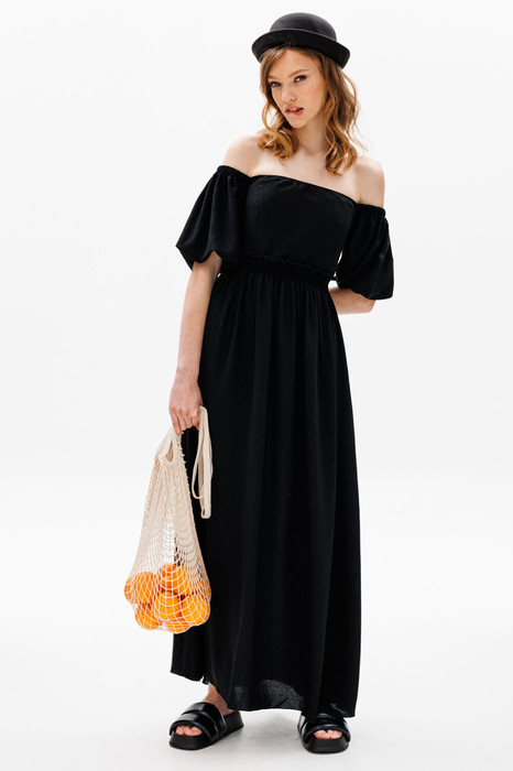 Платье выполнено из плательной ткани. Платье Х-образного силуэта. Центральная часть спинки собрана на венгерку. Рукав длиной до линии локтя, одношовный, расширенный. Верх и низ рукава обработаны эластичной тесьмой. Юбка расширена к низу. В боковых швах обработаны карманы. Юбка настрочена на лиф. Лиф платья на подкладке.