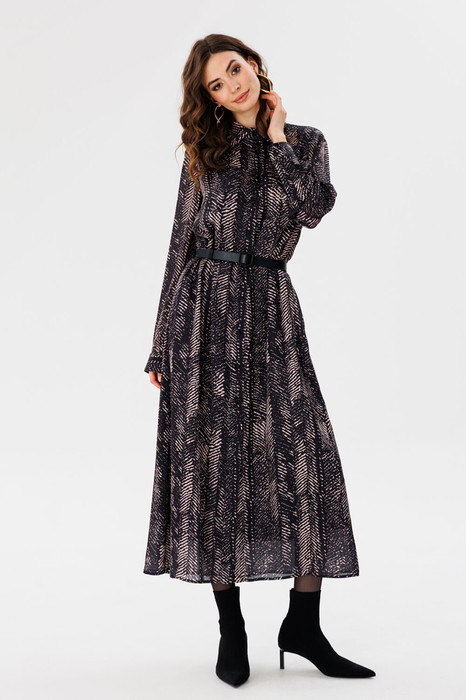 Платье выполнено из креп-атласа с принтом. Платье рубашечного силуэта, длиной миди. Застежка спереди на пуговицы. На спинке кокетка и встречная складка от нее. Воротник стояче-отложной с отрезной стойкой. Рукав втачной, одношовный, с прорезью по низу. Низ рукава на манжете, застегивающейся на пуговицы. В боковых швах карманы. Платье декорировано нашивками по спинке.  Платье на отлетной по низу подкладке.