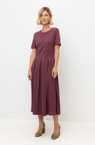 Платье выполнено из однотонной плательной ткани. Платье А-образного силуэта, длиной миди. Застежка на спинке на навесную петлю и пуговицу. Перед декорирован защипами. Воротник-стойка из кружева. Плечевой шов укорочен. Рукав втачной, одношовный, короткий, со сборкой по окату. Низ рукава обработан декоративной тесьмой. Низ платья декорирован широким воланом.