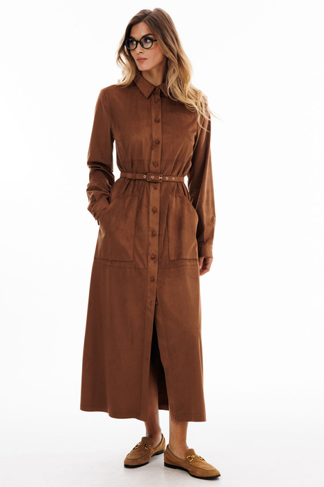 Платье выполнено из тонкой искуственной замши. Платье прямого силуэта, длиной миди. Спереди горизонтальные подрезы, накладные карманы и центральная застежка до верха с планкой на пуговицы. На спинке кокетка и встречная складка. Воротник стояче-отложной с отрезной стойкой и затежкой на пуговицу. Рукав втачной, одношовный. По низу рукава две складки и планка-обтачка. Низ рукава на притачной манжете с застежкой на пуговицу. Платье декорировано нашивкой из натуральной кожи по кокетке спинки. В комплект входит ремень из основной ткани с обтяжной пряжкой.