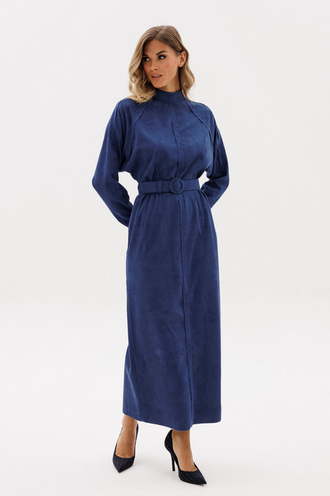 Платье выполнено из тонкой искуственной замши. Платье полуприлегающего силуэта, длиной миди. Платье отрезное по линии талии. Спереди  и на спинке талиевые вытачки и средний шов. Застежка на потайную молнию в среднем шве спинки. Воротник-стойка. Рукав покроя реглан. Средний шов переда, талиевые вытачки, верхний шов рукава и линии реглана обработаны "на лицо". В комплект входит съемный ремень из основной ткани с обтяжной пряжкой.