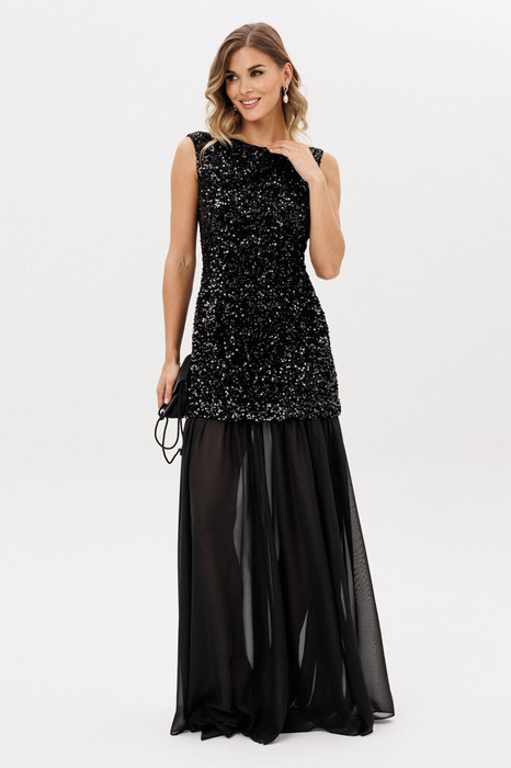 Платье выполнено из барахата с пайетками. Платье Х-образного силуэта, длиной в пол. Верх платья выполнен в виде приталенного платья длиной ниже линии бедер. Застежка на молнию с металлическими звеньями сзади в среднем шве спинки.  Плечевой шов заужен. Горловина формы "лодочка". Нижняя часть платья выполнена из шифона и состоит из 8 клиньев. Верх платья на притачной по низу подкладке.