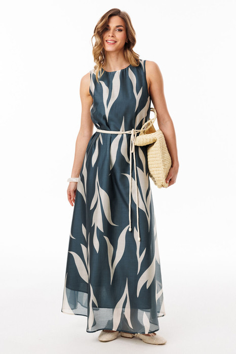 Платье выполнено из плательно-блузочной ткани. Платье А-образного силуэта, длиной миди. Горловина переда округлой формы, горловина спинки с V-образным вырезом, завязывающимся на тесьму из основной ткани. Платье на отлетной по низу подкладке.
