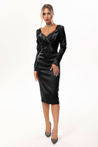 Женское вечернее платье выполнено из тонкой переливающейся ткани. По переду платья глубокий V-образный вырез и запах , так же по переду имеются нагрудные выточки. Рукав длинный втачной. По спинке платья имеются таллиевые выточки и средний шов. По горловине и на талии изделие декорировано пришивными камнями (ручная работа) Платье надевается поверх комбинации.