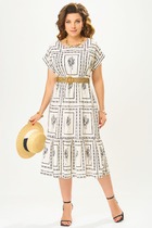Платье женское нарядно-повседневное полуприлегающего силуэта до талии и расширенное к низу. Платье отрезное по линии талии, вырез горловины V-образный с ассиметричными рюшами из тканей двух дизайнов. Проймы обработаны обтчками. В боковых швах плать обработаны карманы, по низу притавчной волан из отделоной ткани(шитье). декором служит пояс из основной ткани.