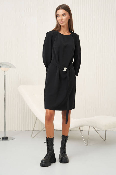 Даже если женщина предпочитает спортивный стиль, в её гардеробе обязательно найдётся хотя бы одно платье. И хорошо, когда это платье универсальное, удобное, носить которое можно в разных вариантах, подходящее для разных мероприятий, меняющее образ своей обладательницы в зависимости от настроения. Предлагаем вам обратить внимание на такое платье силуэта shift в базовом цвете. Платье с втачными рукавами длиной 3/4 с локтевой вытачкой. Вырез горловины овальной формы. По переду - нагрудные вытачки. Спинка с центральным швом и плечевыми вытачками, идущими из линии горловины. По центру горловины спинки - отделочная пата, через которую продевается съёмный декоративный пояс, застёгивающийся спереди на серебристую пряжку. Длина платья по спинке около 92 см. Длина рукава около 48 см.