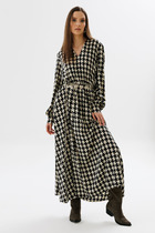 Свободный А-силуэт с цельнокроенным рукавом, ассиметричные линии членения отрезной нижней части платья с коническими вставками и эффектным разрезом. Оригинальный вырез горловины с завязкой-бантом на спинке.