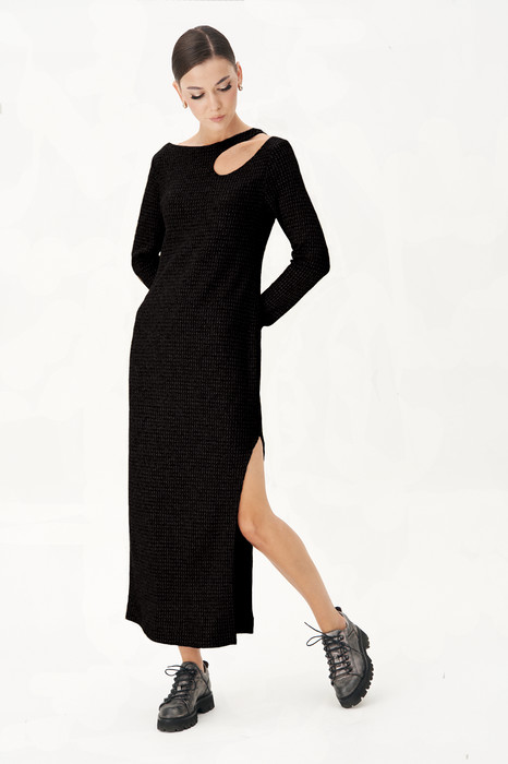 Прилегающий силуэт, втачной покрой, интригующая капля в области декольте, эффектный разрез по боковому шву.
