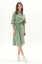 Свободный А-силуэт, изящный V-образный вырез, романтичное крылышко, комфортная длина миди. Полочка с нагрудной вытачкой и карманом в боковом шве. Спинка со средним швом, вырезом каре и эффектной завязкой, удерживающей линию горловины.