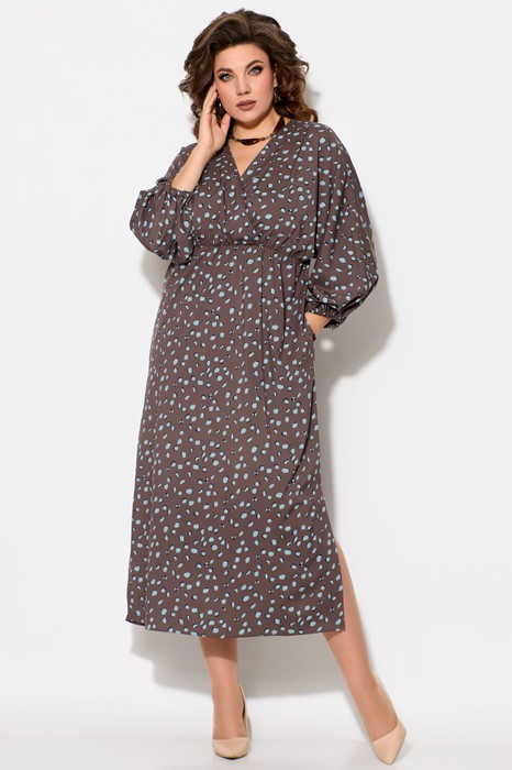 Элегантное женское платье ЛЮТИЦА, длина "миди". Прямого силуэта. Горловина V-образной формы, на "запах". Выше линии талии обработан подрез. Верхняя часть платья собрана на резинку. Рукав цельнокроеный, длинный, расширенный к низу. Низ рукава собран на резинку. В боковых швах обработаны разрезы.