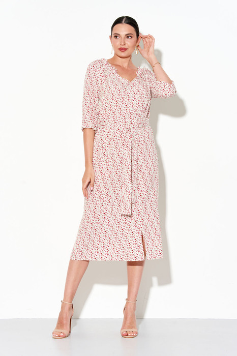 Женское летнее платье полуприлегающего силуэта выполнено из натурального полотна в приятном цветочном принте. Платье на запах с потайной кнопкой в области груди, отрезное по линии талии. По горловине и низу рукавов вставлены резинки, создающие сборки. В боковом шве платья - застежка-молния, в боковых швах - функциональные карманы, по линии талии - пояс-завязка, по низу - волан с разрезами.