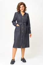 Джинсовое платье-рубашка свободного силуэта с функциональными накладными карманами по переду и в боковых швах, рукава со спущенной линией плеча с манжетами, воротник рубашечный, застежка-планка на петли и пуговицы. В комплекте съемный пояс из основной ткани.  Изделие можно носить как платье, так и как легкий тренч, плащ. Материал при правильном уходе не теряет своих свойств.