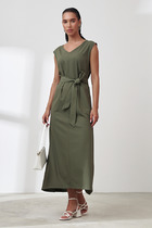 Платье женское отрезное по линии талии, льняное. Перёд с нагрудными вытачками идущими с боковых швов. На верхней части переда расположена декоративная вышивка. Горловина круглой формы. Спинка со средним швом, в которой расположена застёжка горловины на одну пуговицу. Нижняя часть платья собрана на сборку. Рукава одношовные, короткие, гладкие.
