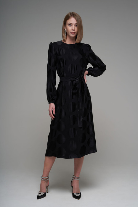 Платье женское А- образного силуэта на подкладке. Полочка с двумя нагрудными вытачками. Спинка со средним швом, в верху обработан разрезик с застежкой на петлю и пуговицу. Рукав длинный со сборкой по окату. Низ рукава на резинке шириной 2см. Горловина обработана подкладкой. К платью прилагается пояс из основной ткани. Длина изделия 115см., рукава 60см.