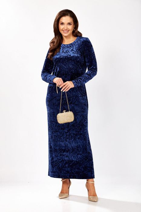 Платье прямого силуэта из бархата.  В боковом шве разрез. Рукав втачной одношовный. По спинке застежка капелька на петлю и пуговицу.  Длина  платья - 136 см, длина рукава -  66 см.
