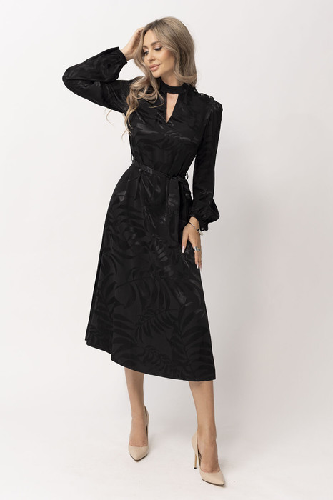 Платье полуприлегающего силуэта, расширенное к низу, c втачным воротником- стойкой, застегивающейся по левому плечу на петли и пуговицы. По переду со средним швом и нагрудными вытачками. По горловине переда- V-образный вырез. Спинка со средним швом. По боковым швам расположены разрезы. Рукав втачной, длинный, со сборкой по окату. По низу рукава- отрезная манжета, по шву притачивания манжеты- сборка. Платье со съемным поясом.