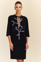 Платье, с центральной двубортной застежкой на пришивные кнопки, с отложным воротником и лацканами. Верхняя часть переда с нагрудными вытачками. Верхняя часть спинки со средним швом и талиевыми вытачками .Нижняя часть переда и спинки расклешенная. Низ переда закладывается в односторонние складки. Шов по талии присборен на резинку. Рукав втачной, короткий, с отложной манжетой. Платье со съемным поясом.