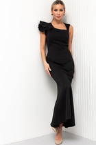 Платье, прямого силуэта, без застежки, без воротника, с V-образным вырезом горловины. По переду с нагрудными вытачками, втачным воланом по горловине переда и спинки, и по среднему шву переда. Спинка цельная. Рукав втачной, короткий, присборен по низу тремя строчками эластичной нитью . Окат рукава со сборкой. По краю воланов и низу рукава- отделочное кружево в цвет основной ткани. Платье со съемным поясом.