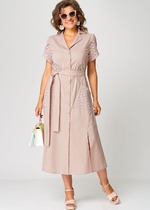 Платье без воротника, с V-образным вырезом горловины, центральной двубортной застежкой на петли и пуговицы по нижней части переда. Платье отрезное по линии талии. По лифу переда полочки с запахом, на уровне груди фиксируются пришивной кнопкой По шву притачивания к нижней части переда лиф переда и спинки присборен. Нижняя часть спинки с талиевыми вытачками. Рукав втачной, длинный, с отрезной манжетой, по шву притачивания манжеты присборен на резинку. Окат рукава присборен.