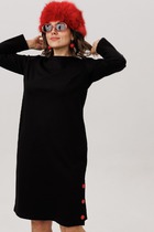 Платье с центральной застежкой на петли и пуговицы, без воротника, с круглым вырезом горловины. Полочки с нагрудными вытачками Боковые швы со шлевками. Платье со съемным поясом. Рукав втачной, 3/4, с отрезной манжетой. Окат и низ рукава со сборкой.