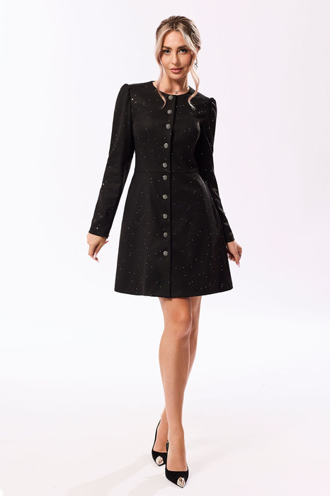 Платье без воротника, с центральной застежкой на петли и пуговицы, с круглым вырезом горловины. Платье отрезное по линии талии. Верхняя часть переда с нагрудными и талиевыми вытачками. Верхняя часть спинки со средним швом, талиевыми вытачками. Нижняя часть платья расклешенная. В боковых швах расположены карманы. Рукав втачной, длинный. По окату рукав присборен.