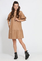 Платье с отрезным воротником- стойкой, застежкой на две навесные петли и пуговицы по стойке со стороны спинки, и потайную молнию в левом боковом шве. Платье отрезное по линии талии. Лиф переда с фигурной кокеткой, переходящей на спинку. Лиф переда и спинки присборен по верхнему и нижнему срезам. Платье по переду и спинке с втачным поясом с фантазийной сборкой. .Нижняя часть платья с фигурной присборенной кокеткой и воланом. Рукав втачной, длинный, с отрезной манжетой, присборенной на резинку. Рукав присборен по окату.