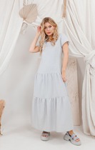 Платье без воротника, с круглым вырезом горловины, застежкой на потайную молнию в среднем шве спинки. Платье отрезное по линии талии. Верхняя часть переда со сборкой в области груди. Спинка со средним швом, талиевыми вытачками по верхней части. Нижняя часть переда с асимметричным рельефным швом, заканчивающимся разрезом.