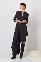 Платье полуприлегающего силуэта, без воротника, с круглым вырезом горловины, с застежкой на потайную молнию по среднему шву спинки. Перед с нагрудными вытачками. Спинка со средним швом. Рукав втачной, длинный, с отрезной манжетой, застегивающейся на одну петлю и пуговицу.