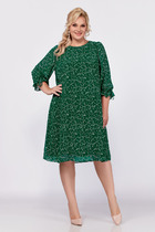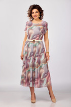 Свободное платье-свитер прямого покроя с разрезом по детали переда с левой стороны. Линия плеча спущенная с втачным рукавом прямого покроя стандартной длины. Вырез горловины округлый со свитерным воротником.